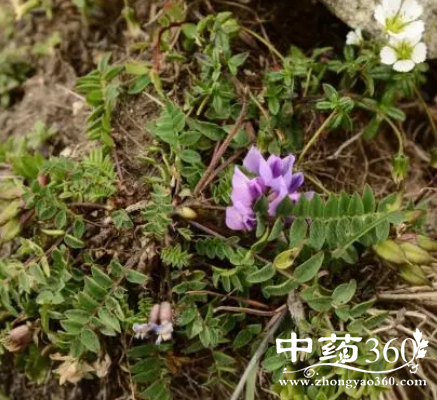 【原形态】多年生草本。主根极粗壮,圆柱形。茎极短。单数羽状复叶,长6~10厘米,叶轴细弱,密生长柔毛;小叶7~13,对生,线形,长1.3~2.5厘米,宽1~2毫米,被长柔毛;托叶小,披针形,与叶柄连合。花2~5朵排列成近头状的总状花序;花萼筒状,萼齿条形;花冠紫红色、紫色或红色。荚果近卵圆形,密生短柔毛。