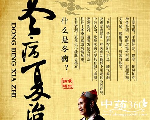 冬病夏治是中国传统医学的一个重要特色,就是利用夏季气温高,机体阳气充沛的有利时机,调整人体的阴阳平衡,使一些宿疾得以恢复。“冬病”指某些好发于冬季,或在冬季加重的病变,如支气管炎、支气管哮喘、风湿与类风湿性关节炎、老年畏寒症以及属于中医脾胃虚寒类疾病。“夏治”指夏季这些病情有所缓解,趁其发作缓解季节,辩证施治,适当地内服和外用一些方药,以预防冬季旧病复发,或减轻其症状。