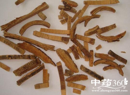 【药材性状】枝皮:卷筒状或槽状,长10~60厘米,厚1.5~3毫米。外表面灰白色、灰棕色至黑棕色或相间呈斑状,平坦或稍粗糙,并有灰白色圆点状皮孔及细斜皱纹,有的具分枝痕。内表面黄白色或棕色,平滑。质硬而脆,断面纤维性,黄白色。无臭,味苦。干皮:长条状块片,厚3~6毫米。外表面灰棕色,具龟裂状沟纹及红棕色圆形或横长的皮孔。质坚硬,断面纤维性较强。