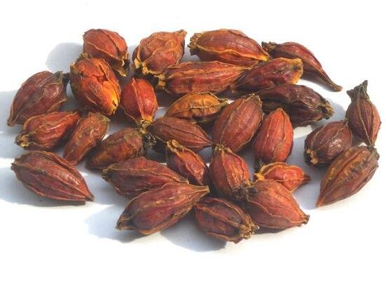 果实倒卵形、椭圆形或长椭圆形,长1.4-3.5cm,直径0.8-1.8cm。表面红棕色或红黄色,微有光泽,有翅状纵棱6-8条,每二翅棱间有纵脉1条,先端有暗黄绿色残存宿萼,先端有6-8条长形裂片,裂片长1-2.5cm,宽2-3mm,多碎断,果实基部收缩成果柄状,末端有圆形果柄痕。果皮薄而脆,内表面鲜黄色或红黄色。有光泽,具隆起的假隔膜2-3条。折断面鲜黄色,种子多数,扁椭圆形或扁矩圆形,聚成球状团块,棕红色,表面有细而密的凹入小点;胚乳角质;胚长形,具心形子叶2片。气微,味微酸苦。以皮薄、饱满、色红黄者为佳。