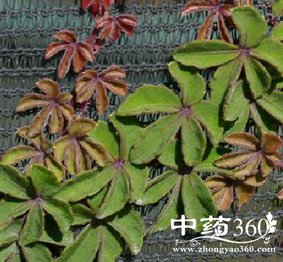 【原形态】毛枝崖爬藤 木质藤本。小枝有密而软的淡红色短绒毛;卷须,单一不分枝,被柔毛。叶为指状或叉指状复叶,互生;总叶柄长达15cm,与小叶柄均被锈色柔毛;小叶片5,中央小叶倒卵形或狭倒卵形,长达19cm,宽约9cm,先端钝圆带锐尖头,基部宽楔形或钝圆形,边缘有锯齿,中央小叶柄长1.8-2.5cm,侧生小叶长约8cm,斜卵形,两侧不对称,小叶柄较短。叶表面沿脉被淡红色绒毛,背面被褐色伏贴柔毛。花小,杂性,异株;伞房状聚伞花序腋生,被绒毛;雌花萼片被绒毛或具乳头状突起,4齿;花瓣顶端常有小尖,广展;雄蕊4,不育,花丝基部膨大,花盘不明显,与子房基部合生;子房2室,柱头4裂。浆果肉质。