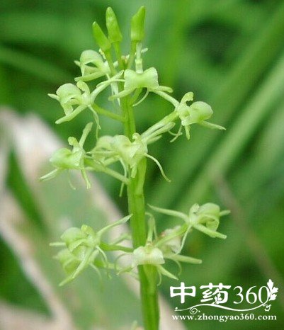【原形态】多年生草本,高30~40厘米。根茎横生。茎无毛,不分枝。叶互生;近基部叶约3片,叶片狭长圆形或披针形,长14~18厘米,全缘,无毛,叶脉平行,基部鞘状;茎上部及中部的叶小,披针形,长8~20毫米。总状花序顶生;花淡黄绿色,长约1厘米,无毛;花被唇瓣有长距,距细,长6~8毫米。