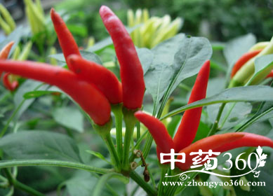 (方歌)祛风散瘀指天椒,跌打肿痛力能消,舌头缠指与蛇咬,浸酒塗敷毒自凋,根煲水蚧疗脚软,叶煎猪肝目更清。