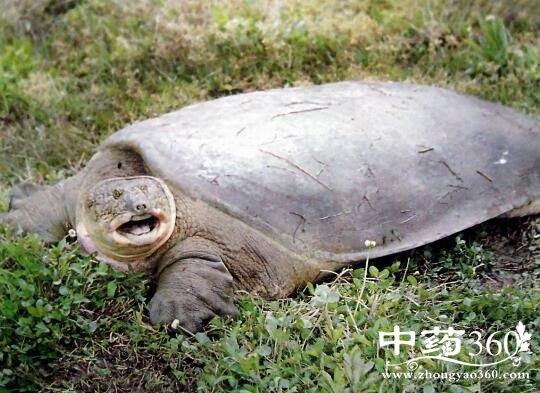 鼋,背甲长33-47cm,宽32.5-41cm。头较小,软吻突极短,仅略凸出吻端,不到眼径一半。背甲近圆形,被革质皮肤,前缘及裙边光滑无疣,无纵棱。腹甲平滑,后叶较短,幼鼋背面嵴棱明显,裙边有疣粒。四肢不能缩入壳内。内侧3指、趾具爪,蹼发达,有栉状肤褶及腹棱;尾短,不露出裙边。背面橄榄色,具黄色斑点,腹面白色。幼鼋生活时带黄色。
