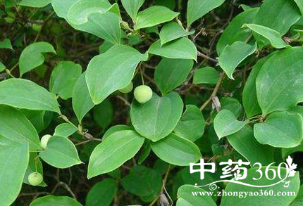 植物形态: 攀缘灌木。无毛,小枝有钝棱。叶互 生;叶柄下部1/3 ~ 1/4处有卷须和狭鞘;叶纸质,卵状 披针形或心形,先端渐尖或短渐尖,有短尖头,基部心形; 主脉5~7条,小脉网状。伞形花序生于叶腋,或生于褐色 的苞片内;总花梗扁,花序托球形;花梗纤细,雄花花被 筒长圆形或倒卵形,顶端有3枚钝齿,雄蕊3枚,长约为花 被的2/3,花药长为花丝的1/2 ;雌花花被筒卵形,具3枚 退化雄蕊,子房卵形,柱头3裂。浆果卵圆形。