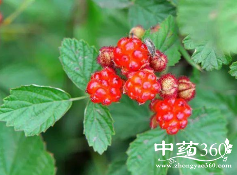 【植物形态】:落叶小灌木,被短毛和倒生皮刺。三出复叶互生,顶端小叶较大,阔倒卵形或近圆形,长2.5~5cm,宽2~5cm,边缘有不规则锯齿,上面疏生长毛,下面密生白色绒毛;花萼5裂,被长柔毛或小刺;花瓣5,粉红色,倒卵形;雄蕊多数;心皮多数,分离,生于凸起的花托上。聚合果球形,熟时红色可食。花期5~6月,果期7~8月。