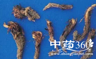 【药材性状】略呈圆锥形,多弯曲,长5~18厘米。根茎短小,上端有茎,叶残基,呈狭长的膜质片状或纤维状。外层黑棕色,内层棕色或黄色。根单一或数条交结、分枝或并列,直径0.3~1厘米。表面棕褐色,皱缩,有细根及须根。质松脆,易折断,断面粗糙,皮部深棕色,常成裂片状,木部黄白色。气特异,味苦而辛,有清凉感。