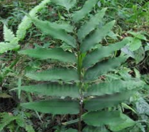 【原形态】植株高30-80m。根茎短粗而斜升,顶端和叶柄基部被棕褐色、阔披针形鳞片。叶簇生;叶柄长15-20cm,禾秆色,向上光滑;叶片革质,长圆披针形,长25-60cm,宽12-20cm,渐尖头,仅叶轴、羽轴和中脉有少数棕色多细胞的短毛,二回羽状深裂;羽片约20对,披针形,下部3-4对羽片略缩短,中部羽片长12-14cm,宽1.5-2cm,羽状深裂几达羽轴;裂片18-20对,平展,镰状长圆形,基部1对较大,边缘有细锯齿;叶脉羽状,不甚明显,在裂片上有单一的侧脉5-7对。孢子囊群短线形,成熟时呈椭圆形,背生于侧脉上侧,每裂片有2-5对;囊群盖新月形,棕色,全缘,宿存。