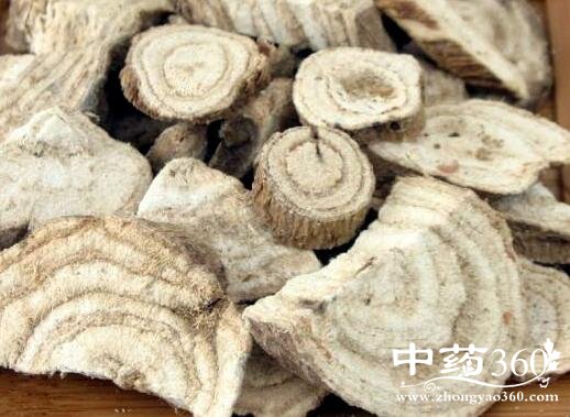 真品葛根 外观呈长圆柱形,药材多纵切或斜切片成板状厚片,长短不等,长约20厘米左右,直径6~10厘米,厚0.7~1.3厘米,外表白色或淡棕色,有时可见残存的棕色外皮;质硬而重,切面粗糙,富粉性,并含大量纤维,横断面可见由纤维所形成的同心性环层,纵切片可见纤维性与粉质相间,形成纵纹;闻之无味,口尝味微甜。