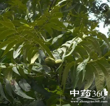 【原形态】落叶乔木,高20-25m。树皮灰白色,幼时平滑,老时浅纵裂。小枝被短腺毛,具明显的叶痛和皮孔;冬芽被芽鳞;髓部白色,薄片状。奇数羽状复叶,互生,长40-50cm,小叶5-9枚,有时13枚,先端1片常较大,椭圆状卵形至长椭圆形,长6-15cm,宽3-6cm,先端钝圆或锐尖,基部偏斜,近于圆形,全缘,表面深绿色,有光泽,背面淡绿色,有侧脉11-9对,脉腋内有一簇短柔毛。花单性,雌雄同株,与叶同时开放,雄葇荑花序腋生,下垂,长5-10cm,花小而密集,雄花有苞片1,长圆形,小苞片2,长卵形,花被片1-4,均被腺毛,雄蕊6-30;雌花序穗状,直立,生于幼枝顶端,通常有雌花1-3朵,总苞片3枚,长卵形,贴生于子房,花后随子房增大;花被4裂,裂片线形,高出总苞片;子房下位,2枚心皮组成,花柱短,柱头2裂,呈羽毛状,鲜红色。果实近球形,核果状,直径4-6cm,外果皮绿色,由总苞片及花被发育而成,表面有斑点,中果皮肉质,不规则开裂,内果皮骨质,表面凹凸不平,有2条纵棱,先端具短尖头,内果皮壁内具空隙而有皱折,隔膜较薄,内里无空隙。花期5-6月,果期9-10月。